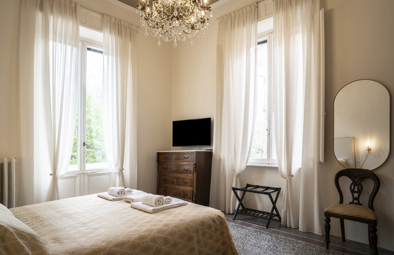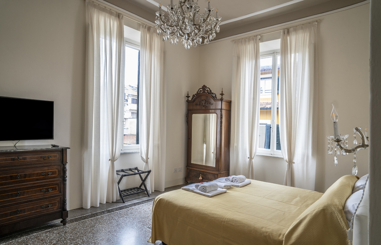 Very roomy and charming double bedroom, furnished with antique furniture and equipped with a wardrobe, a Smart TV, air conditioning, coffee and tea machines. The room has a very large bathroom, tiled in marble. An extra bed can be added to accommodate three people in total.