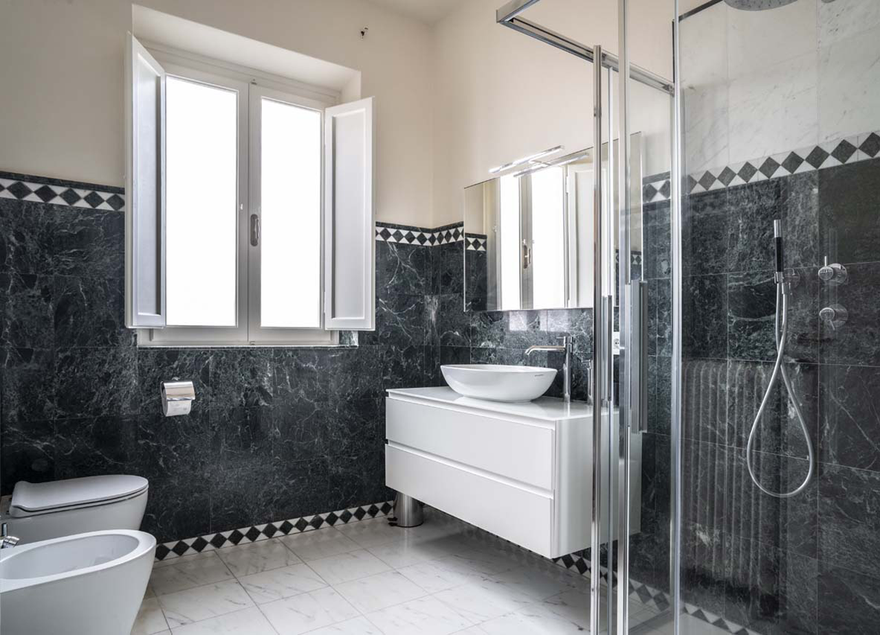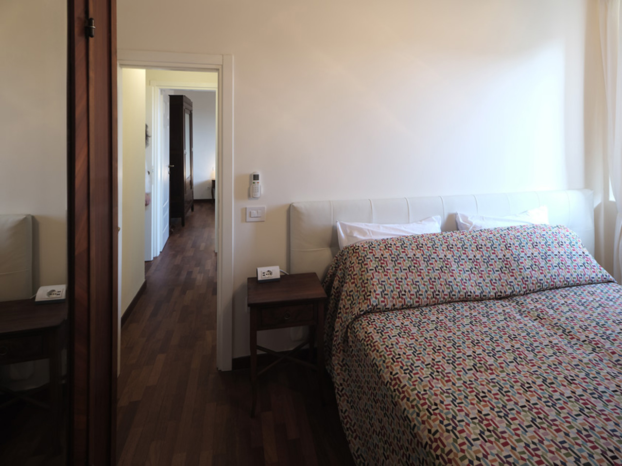 A perfect solution for a family or two couples of friends, this quadruple bedroom is composed of a bedroom with a double bed and a second bedroom with two single beds, which can be adjusted to a double bed as well. The spacious bathroom, tiled in marble, is located between the two rooms. Each room is equipped with a wardrobe, a Smart TV and air conditioning.